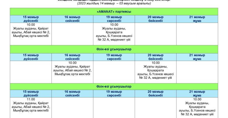 Басты бет/Basty bet/2023 жылғы 4 маусымға тағайындалған Жуалы ауданының Ақсай және Қошқарата ауылдық округтері әкімдерінің сайлауына байланысты әкімдікке кандидаттардың сайлаушылармен кездесу өткізу кестелері Basty bet 2023 жылғы 4 маусымға тағайындалған Жуалы ауданының Ақсай және Қошқарата ауылдық округтері әкімдерінің сайлауына байланысты әкімдікке кандидаттардың сайлаушылармен кездесу өткізу кестелері admin Мамыр 12, 2023 0 178 Less than a minute
