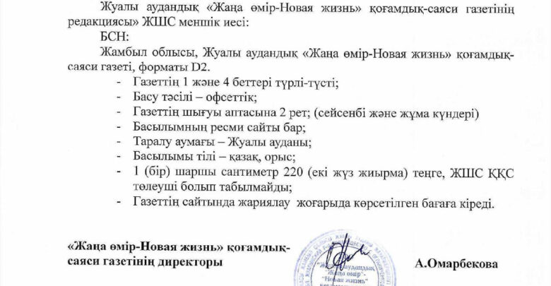 Басты бет/Basty bet/Жамбыл облысы, Жуалы ауданының Боралдай, Қарасаз, Мыңбұлақ ауылдық округтері әкімдерінің сайлауы алдындағы үгіт материалдарын орналастыруға баспасөз бетінен орын беру туралы ПРАЙС-ПАРАҚША Basty bet Жамбыл облысы, Жуалы ауданының Боралдай, Қарасаз, Мыңбұлақ ауылдық округтері әкімдерінің сайлауы алдындағы үгіт материалдарын орналастыруға баспасөз бетінен орын беру туралы ПРАЙС-ПАРАҚША admin Сәуір 10, 2025 0 141 Less than a minute